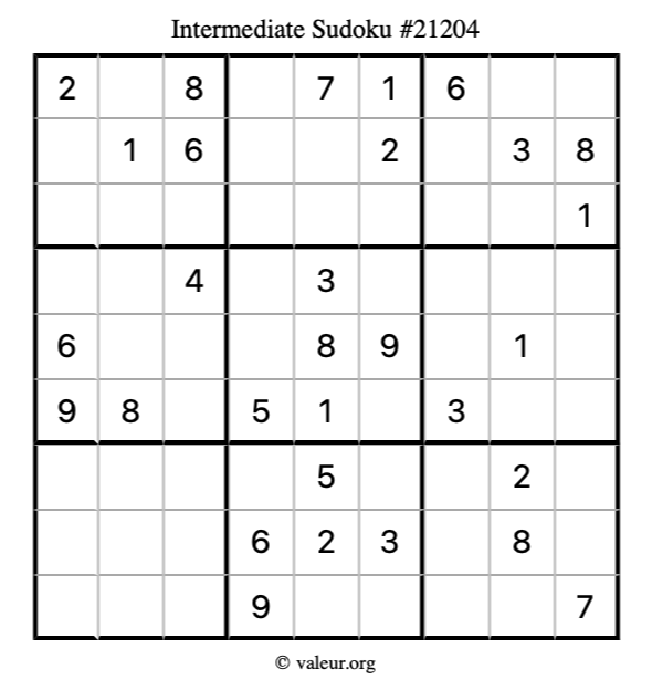 Here is our printable Intermediate Sudoku Puzzle #21204. You are welcome to print a copy for yourself and solve it the old-fashioned way with a pencil and an eraser!