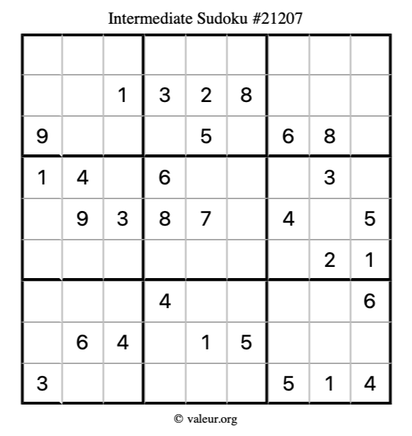 Here is our printable Intermediate Sudoku Puzzle #21207. You are welcome to print a copy for yourself and solve it the old-fashioned way with a pencil and an eraser!