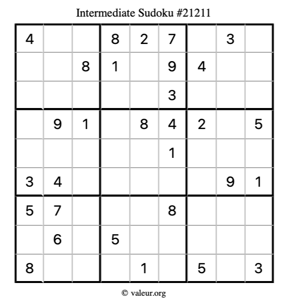 Here is our printable Intermediate Sudoku Puzzle #21211. You are welcome to print a copy for yourself and solve it the old-fashioned way with a pencil and an eraser!