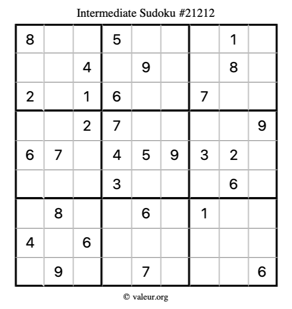 Here is our printable Intermediate Sudoku Puzzle #21212. You are welcome to print a copy for yourself and solve it the old-fashioned way with a pencil and an eraser!