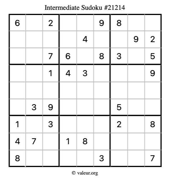 Here is our printable Intermediate Sudoku Puzzle #21214. You are welcome to print a copy for yourself and solve it the old-fashioned way with a pencil and an eraser!