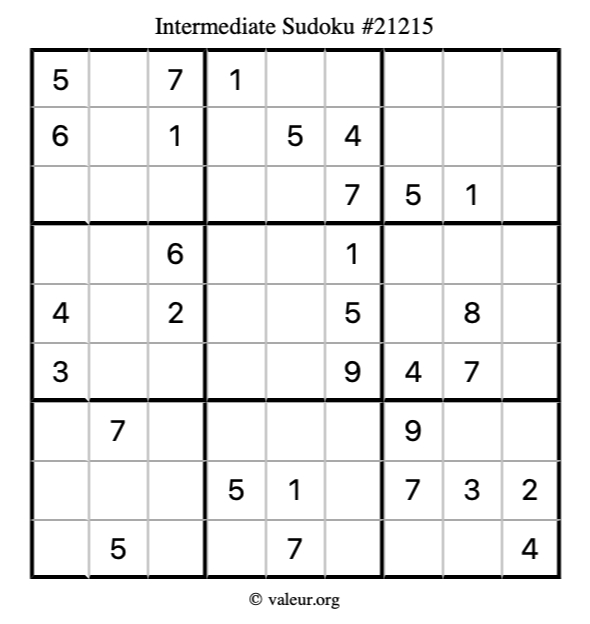 Here is our printable Intermediate Sudoku Puzzle #21215. You are welcome to print a copy for yourself and solve it the old-fashioned way with a pencil and an eraser!