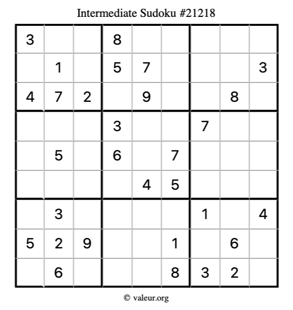 Here is our printable Intermediate Sudoku Puzzle #21218. You are welcome to print a copy for yourself and solve it the old-fashioned way with a pencil and an eraser!