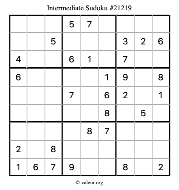 Here is our printable Intermediate Sudoku Puzzle #21219. You are welcome to print a copy for yourself and solve it the old-fashioned way with a pencil and an eraser!