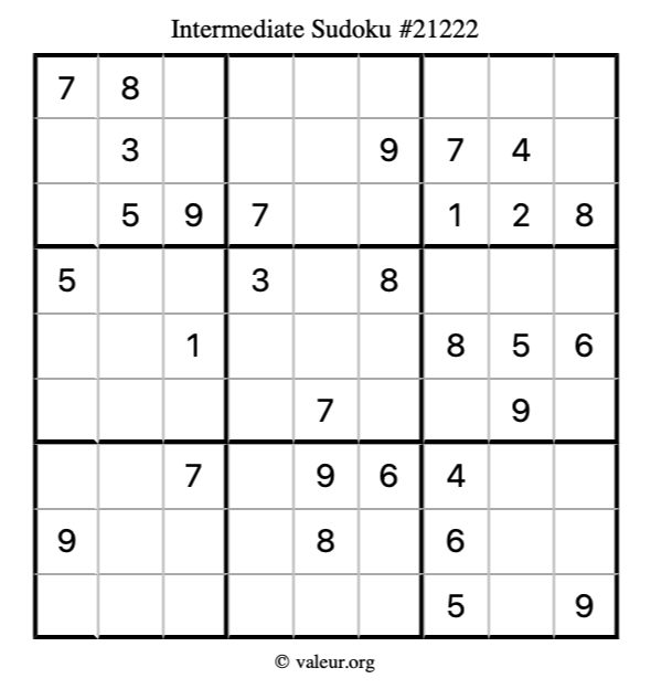 Here is our printable Intermediate Sudoku Puzzle #21222. You are welcome to print a copy for yourself and solve it the old-fashioned way with a pencil and an eraser!