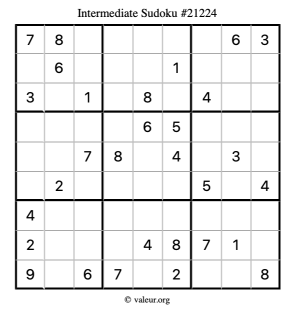 Here is our printable Intermediate Sudoku Puzzle #21224. You are welcome to print a copy for yourself and solve it the old-fashioned way with a pencil and an eraser!