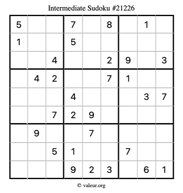 Here is our printable Intermediate Sudoku Puzzle #21226. You are welcome to print a copy for yourself and solve it the old-fashioned way with a pencil and an eraser!