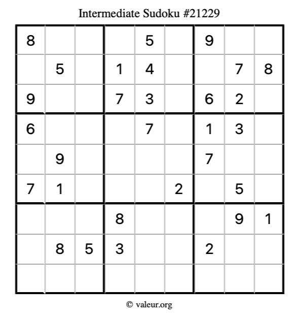 Here is our printable Intermediate Sudoku Puzzle #21229. You are welcome to print a copy for yourself and solve it the old-fashioned way with a pencil and an eraser!