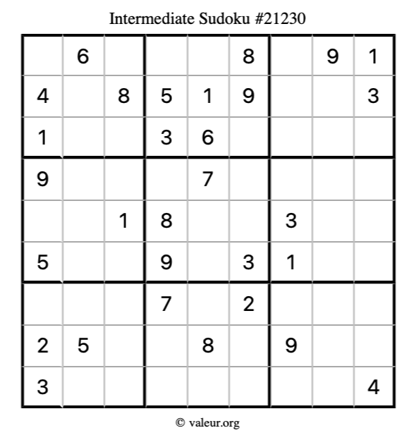 Here is our printable Intermediate Sudoku Puzzle #21230. You are welcome to print a copy for yourself and solve it the old-fashioned way with a pencil and an eraser!