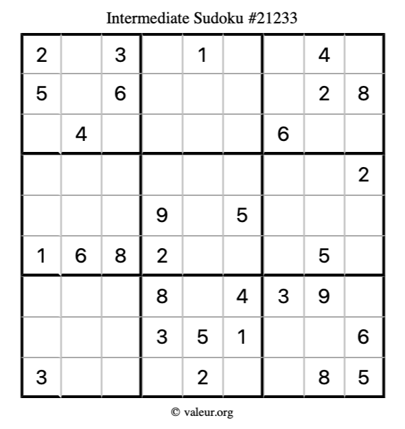Here is our printable Intermediate Sudoku Puzzle #21233. You are welcome to print a copy for yourself and solve it the old-fashioned way with a pencil and an eraser!