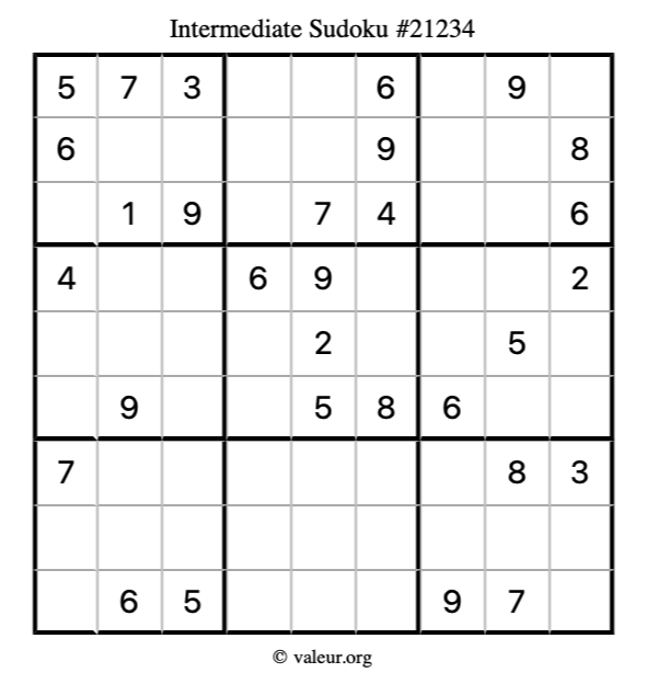 Here is our printable Intermediate Sudoku Puzzle #21234. You are welcome to print a copy for yourself and solve it the old-fashioned way with a pencil and an eraser!