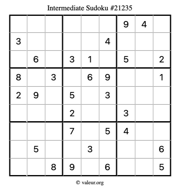 Here is our printable Intermediate Sudoku Puzzle #21235. You are welcome to print a copy for yourself and solve it the old-fashioned way with a pencil and an eraser!