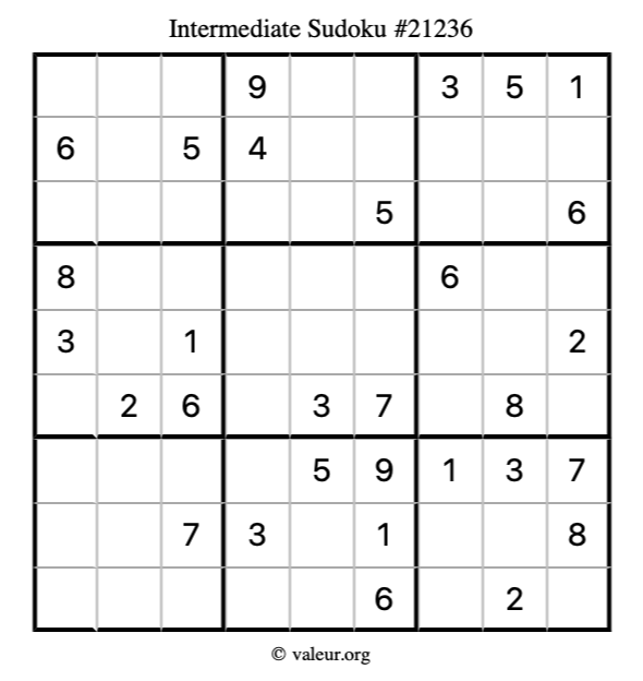 Here is our printable Intermediate Sudoku Puzzle #21236. You are welcome to print a copy for yourself and solve it the old-fashioned way with a pencil and an eraser!