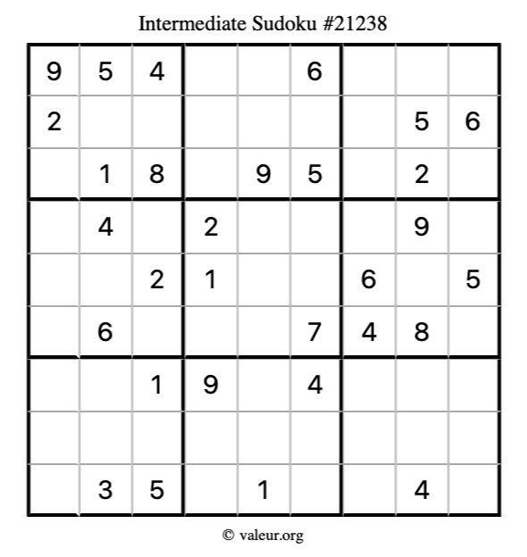 Here is our printable Intermediate Sudoku Puzzle #21238. You are welcome to print a copy for yourself and solve it the old-fashioned way with a pencil and an eraser!