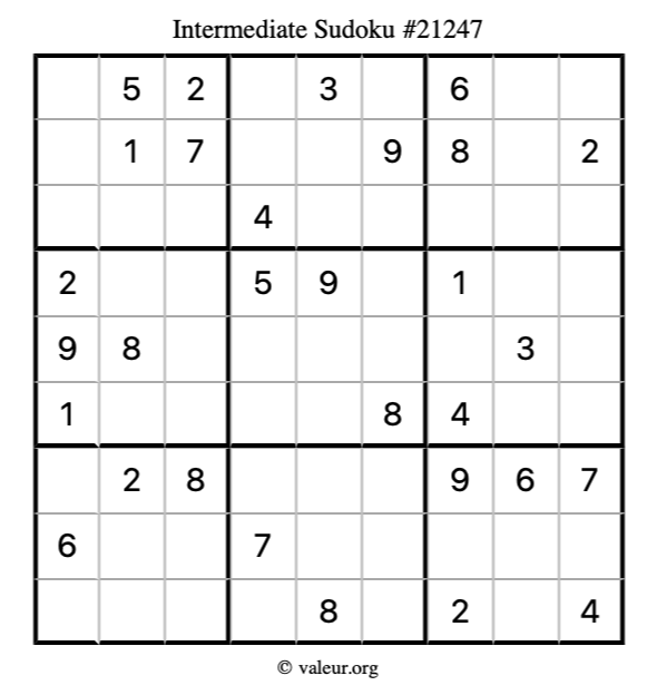 Here is our printable Intermediate Sudoku Puzzle #21247. You are welcome to print a copy for yourself and solve it the old-fashioned way with a pencil and an eraser!