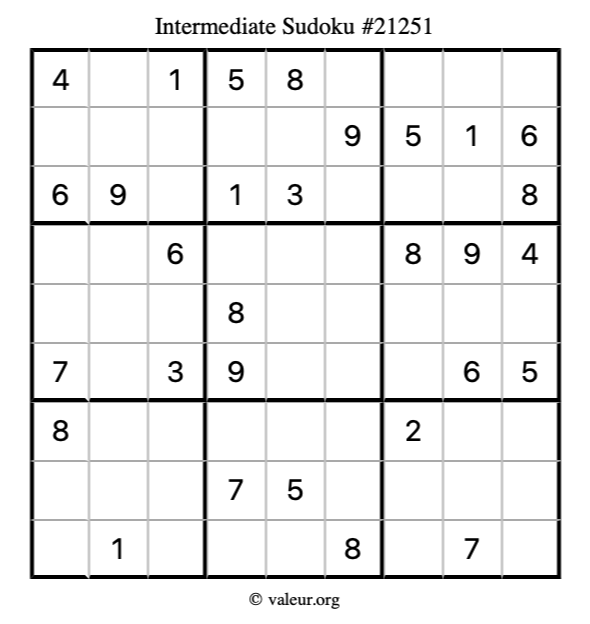 Here is our printable Intermediate Sudoku Puzzle #21251. You are welcome to print a copy for yourself and solve it the old-fashioned way with a pencil and an eraser!