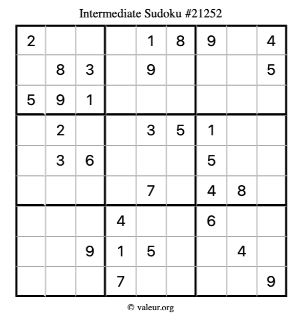 Here is our printable Intermediate Sudoku Puzzle #21252. You are welcome to print a copy for yourself and solve it the old-fashioned way with a pencil and an eraser!