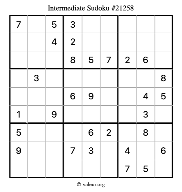 Here is our printable Intermediate Sudoku Puzzle #21258. You are welcome to print a copy for yourself and solve it the old-fashioned way with a pencil and an eraser!