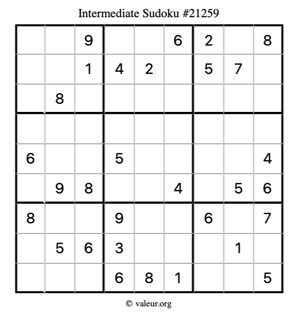 Here is our printable Intermediate Sudoku Puzzle #21259. You are welcome to print a copy for yourself and solve it the old-fashioned way with a pencil and an eraser!