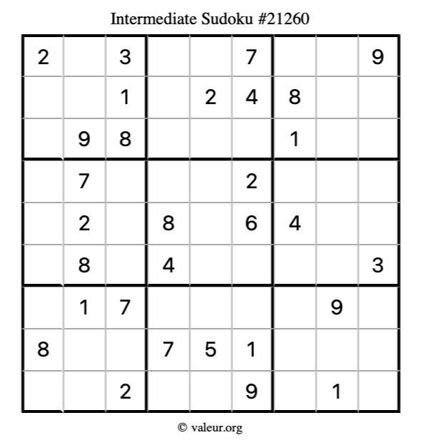 Here is our printable Intermediate Sudoku Puzzle #21260. You are welcome to print a copy for yourself and solve it the old-fashioned way with a pencil and an eraser!
