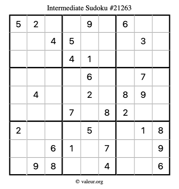Here is our printable Intermediate Sudoku Puzzle #21263. You are welcome to print a copy for yourself and solve it the old-fashioned way with a pencil and an eraser!