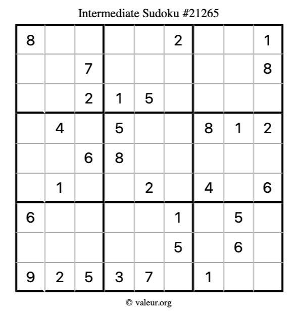 Here is our printable Intermediate Sudoku Puzzle #21265. You are welcome to print a copy for yourself and solve it the old-fashioned way with a pencil and an eraser!