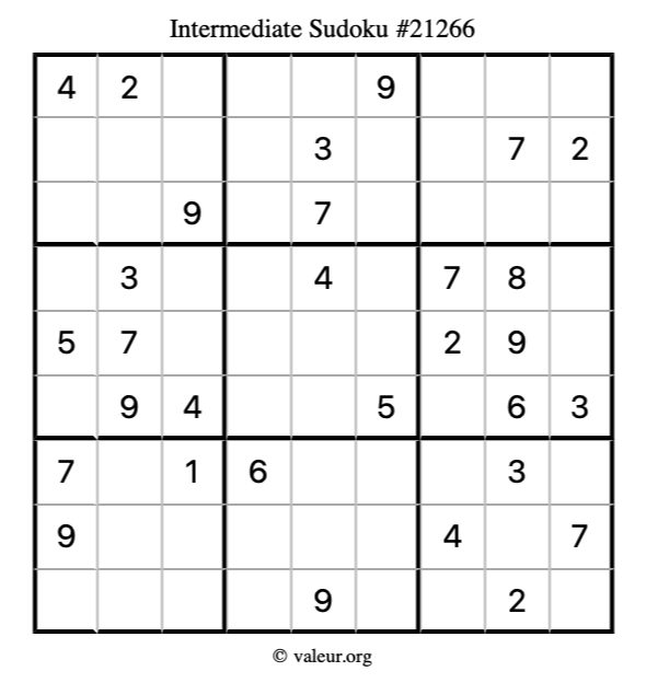 Here is our printable Intermediate Sudoku Puzzle #21266. You are welcome to print a copy for yourself and solve it the old-fashioned way with a pencil and an eraser!