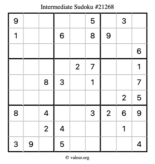 Here is our printable Intermediate Sudoku Puzzle #21268. You are welcome to print a copy for yourself and solve it the old-fashioned way with a pencil and an eraser!