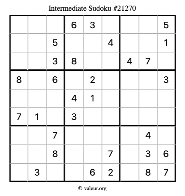 Here is our printable Intermediate Sudoku Puzzle #21270. You are welcome to print a copy for yourself and solve it the old-fashioned way with a pencil and an eraser!