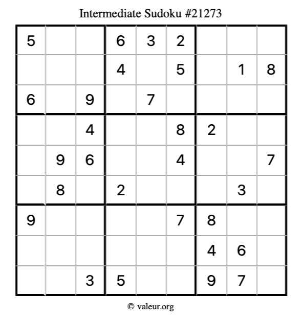 Here is our printable Intermediate Sudoku Puzzle #21273. You are welcome to print a copy for yourself and solve it the old-fashioned way with a pencil and an eraser!