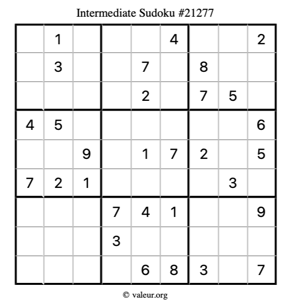 Here is our printable Intermediate Sudoku Puzzle #21277. You are welcome to print a copy for yourself and solve it the old-fashioned way with a pencil and an eraser!