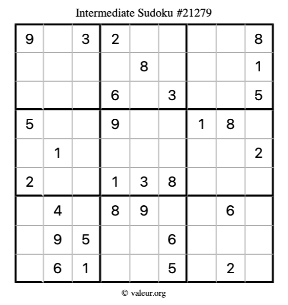 Here is our printable Intermediate Sudoku Puzzle #21279. You are welcome to print a copy for yourself and solve it the old-fashioned way with a pencil and an eraser!