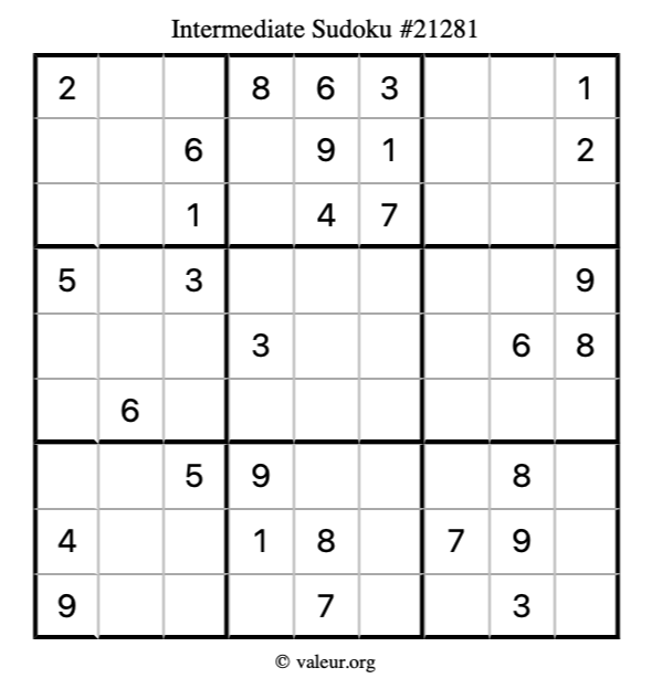 Here is our printable Intermediate Sudoku Puzzle #21281. You are welcome to print a copy for yourself and solve it the old-fashioned way with a pencil and an eraser!