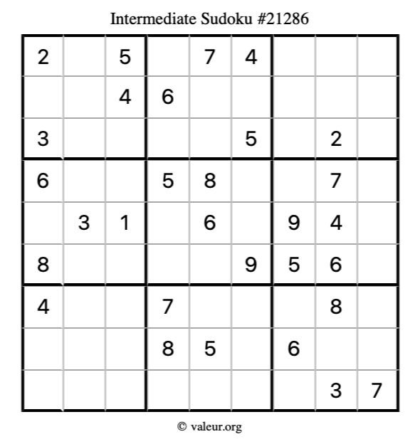 Here is our printable Intermediate Sudoku Puzzle #21286. You are welcome to print a copy for yourself and solve it the old-fashioned way with a pencil and an eraser!