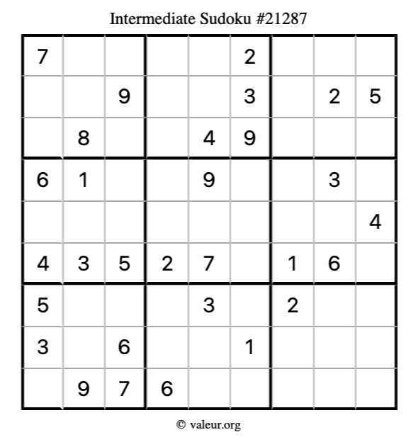 Here is our printable Intermediate Sudoku Puzzle #21287. You are welcome to print a copy for yourself and solve it the old-fashioned way with a pencil and an eraser!