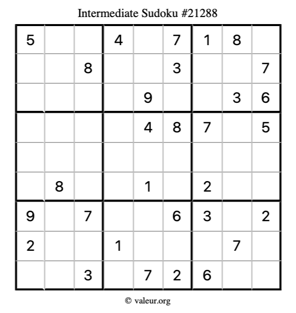 Here is our printable Intermediate Sudoku Puzzle #21288. You are welcome to print a copy for yourself and solve it the old-fashioned way with a pencil and an eraser!