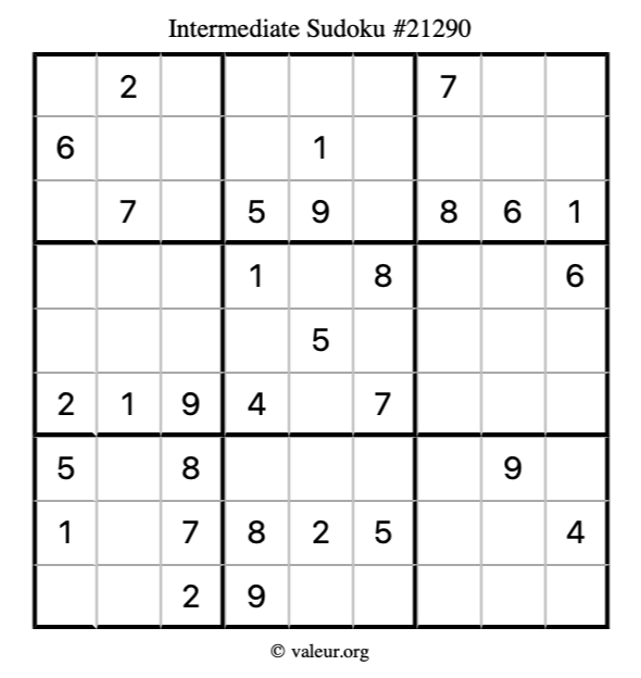 Here is our printable Intermediate Sudoku Puzzle #21290. You are welcome to print a copy for yourself and solve it the old-fashioned way with a pencil and an eraser!