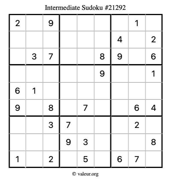 Here is our printable Intermediate Sudoku Puzzle #21292. You are welcome to print a copy for yourself and solve it the old-fashioned way with a pencil and an eraser!