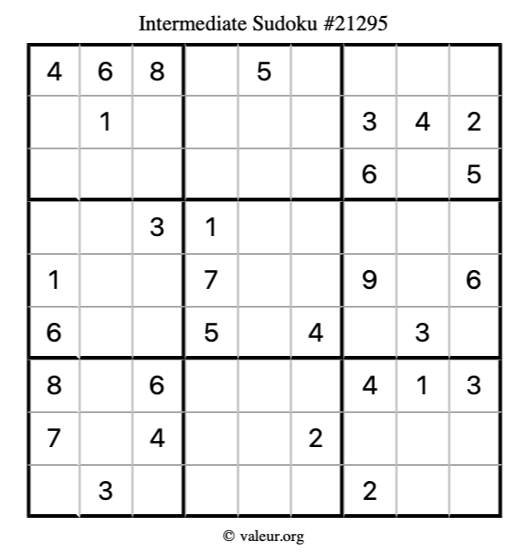 Here is our printable Intermediate Sudoku Puzzle #21295. You are welcome to print a copy for yourself and solve it the old-fashioned way with a pencil and an eraser!