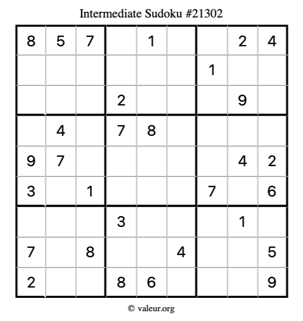 Here is our printable Intermediate Sudoku Puzzle #21302. You are welcome to print a copy for yourself and solve it the old-fashioned way with a pencil and an eraser!