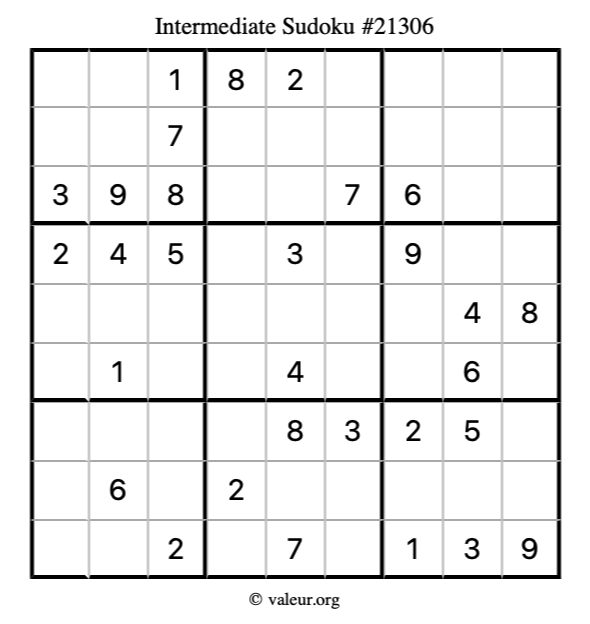 Here is our printable Intermediate Sudoku Puzzle #21306. You are welcome to print a copy for yourself and solve it the old-fashioned way with a pencil and an eraser!