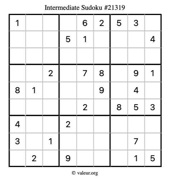 Here is our printable Intermediate Sudoku Puzzle #21319. You are welcome to print a copy for yourself and solve it the old-fashioned way with a pencil and an eraser!