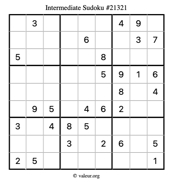 Here is our printable Intermediate Sudoku Puzzle #21321. You are welcome to print a copy for yourself and solve it the old-fashioned way with a pencil and an eraser!