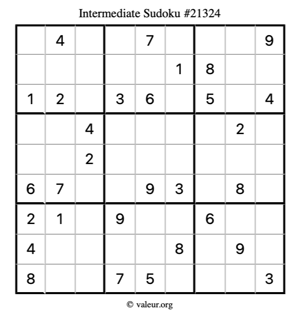 Here is our printable Intermediate Sudoku Puzzle #21324. You are welcome to print a copy for yourself and solve it the old-fashioned way with a pencil and an eraser!