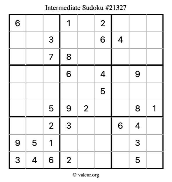Here is our printable Intermediate Sudoku Puzzle #21327. You are welcome to print a copy for yourself and solve it the old-fashioned way with a pencil and an eraser!