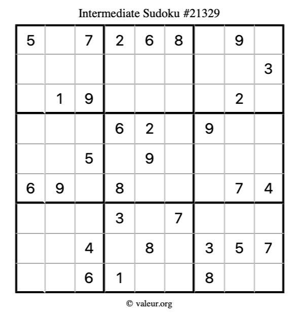 Here is our printable Intermediate Sudoku Puzzle #21329. You are welcome to print a copy for yourself and solve it the old-fashioned way with a pencil and an eraser!
