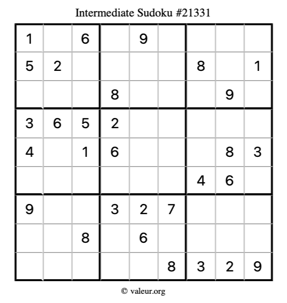 Here is our printable Intermediate Sudoku Puzzle #21331. You are welcome to print a copy for yourself and solve it the old-fashioned way with a pencil and an eraser!