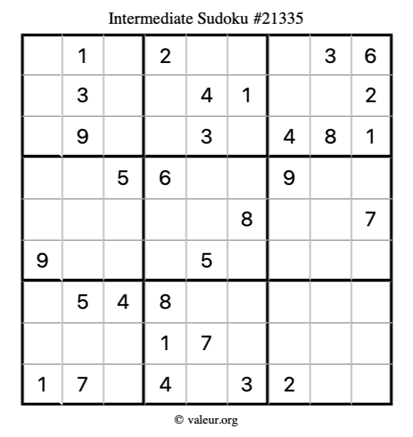 Here is our printable Intermediate Sudoku Puzzle #21335. You are welcome to print a copy for yourself and solve it the old-fashioned way with a pencil and an eraser!