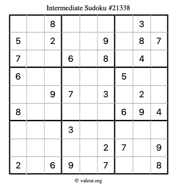 Here is our printable Intermediate Sudoku Puzzle #21338. You are welcome to print a copy for yourself and solve it the old-fashioned way with a pencil and an eraser!