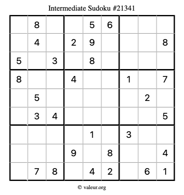 Here is our printable Intermediate Sudoku Puzzle #21341. You are welcome to print a copy for yourself and solve it the old-fashioned way with a pencil and an eraser!